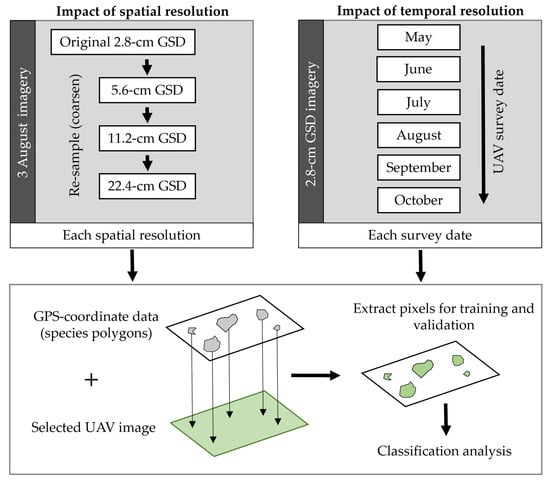 Outline of the data used to explore the impact of the spatial and temporal resolutions of the UAV imagery on the classification accuracy.