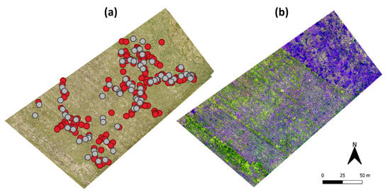 RGB (true-colour composite, (a)) and multispectral (false-colour composite, (b); RGB = b4-b2-b1) orthomosaics of the study area taken on 3 August 2021. The RGB image on the left (a) shows the location of training (red) and validation (grey) data points used in the classification analysis.
