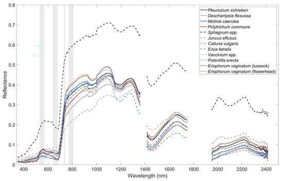 Spectral signatures of the dominant vegetation species at Auchencorth Moss. The reflectance data shown are from the field spectroscopy measurements conducted with the ASD on 23 July 2021. The gaps in the presented spectra result from the removal of bands affected by noise and atmospheric water absorption features. The wavelengths sampled by the four Parrot Sequoia bands (green, red, red-edge, and NIR, respectively) are depicted by the vertical grey bars towards the left-hand side of the plot.