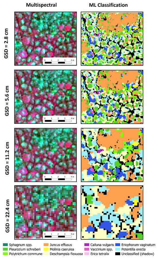 The present study examined the use of ultra-high-resolution (2.8 cm GSD) multispectral UAV imagery for classifying vegetation at the species level. Despite strong spatial heterogeneity, 11 dominant species at the site were classified with overall accuracy of almost 70% using an ML classifier. The species C. vulgaris, J. effusus, and Sphagnum were classified with the highest accuracy, whereas the sedge E. vaginatum was often misclassified as the graminoid species M. caerulea or D. flexuosa. Surprisingly, little difference in accuracy for classifications employing imagery of 2.8 to 11.2 cm GSD was observed. However, a large drop in accuracy was seen when using imagery of coarser resolution (22.4 cm GSD). Further analysis and testing at a range of sites would help to better constrain the trends in accuracy under decreasing image resolution. This information would provide valuable guidance for future studies, allowing researchers to choose the most efficient study design.