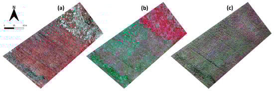 Multispectral imagery of Auchencorth Moss over the 2021 growing season. Shown are false-colour composites (RGB = b4-b2-b1) of the survey area acquired on three dates: 14 May (a); 3 August (b); and 15 October (c).
