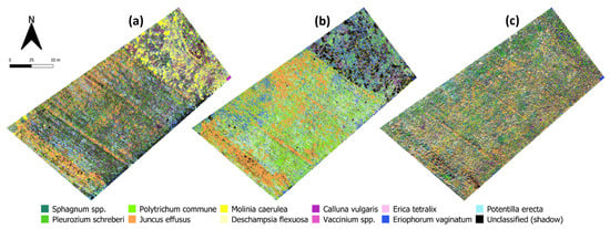 Despite these advancements in the spatial resolution of data, much work has focused on the mapping of distinct habitat types at the landscape level. Anderson et al., for example, mapped peatland biotopes across a raised bog in the UK using IKONOS data (4 m resolution), with classes ranging from ‘active raised bog’ to ‘drained’ and ‘degraded bog’ [20]. Similarly, Palace et al. used 3 cm resolution UAV data to classify broad vegetation cover (e.g., ‘hummock’, ‘wet’, and ‘tall shrub’) in northern Sweden [27]. At a smaller scale, research has been conducted to map individual PFTs (e.g., [28,29]). Although changes in the distribution of PFTs over time may be useful for indicating long-term changes in carbon storage for example [30,31], PFT-level classifications mask a large amount of heterogeneity. Few studies have examined the feasibility of species-level classifications, and those that have done often focused on a single species of interest only [29,32,33].