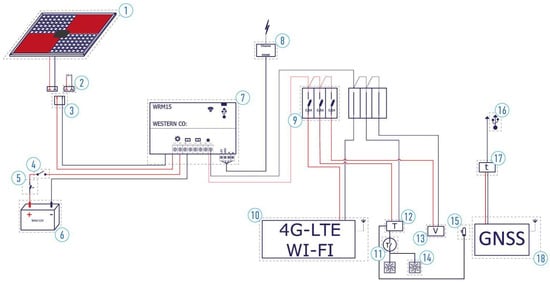 Figure 2. S-GCP components’ connection: (1) solar panel; (2) power socket (DC max, 50 V); (3) power plug (DC max, 50 V); (4) unipolar switch; (5) disconnector with fuse holder; (6) solar battery (9 Ah, 12 V); (7) charge regulator; (8) RS485/ethernet interface; (9) disconnector with fuse holder; (10) RouterBoard (Mikrotik); (11) NO contact; (12) temperature control module; (13) voltmeter; (14) cooling fan; (15) temperature probe; (16) USB connector; (17) delay switch (30 s); (18) GNSS receiver; red lines indicate positive electrical cables, black lines indicate negative.