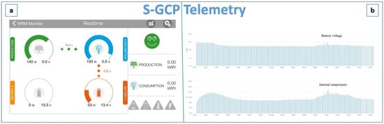 • a web app interface, if the user is close to the S-GCP, through a Bluetooth connection (Figure 3a), ensuring the monitoring and the configuration of different parameters, including the produced power, load power, and battery charging;