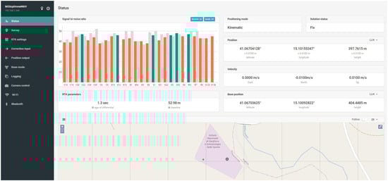 Figure 4. GNSS ReachView web interface. On the left, there are various tools for the system’s settings; the central part displays a comprehensive overview of the GNSS’s status, which includes the number and SNR of satellites, the positioning mode, the solution status, and the accuracy and coordinates of both the base and rover and their locations on a map.
