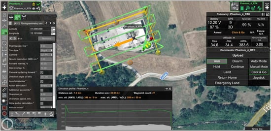 Figure 6. UgCS Enterprise v. 4.20 software interface for UAS mission planning. In the left panel are shown the set parameters for the flight plan; the right panel shows the UAS telemetry, and the bottom window displays the survey’s altimetry and number of waypoints.