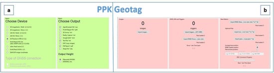 Photo geotagging is performed using RedToolbox v. 3.1 software (Figure 7https://www.redcatch.at/redtoolbox/ accessed on 16 March 2024). First, you need to choose the GNSS data format and trigger used by the drone (DJI Phantom 4 RTK L1/L2) and then the format of the correct data output from the software (in this case, Agisoft project .psx, TextFile .txt, and Pdf Report .pdf files). Moreover, the choice of the output coordinate system is required, and in this case, the ellipsoidal model WGS84 was selected.