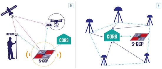 Figure 8. (a) S-GCP in base/NTRIP configuration to provide real-time GNSS correction to rover and UAS; (b) S-GCP in rover/base configuration to receive real-time GNSS corrections from the CORS and save the raw data locally, using them later in PPK.