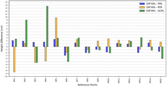 Figure 10. Graphical comparison among the height differences (cm) of the three DEMs measured for the 15 RPs that were considered.