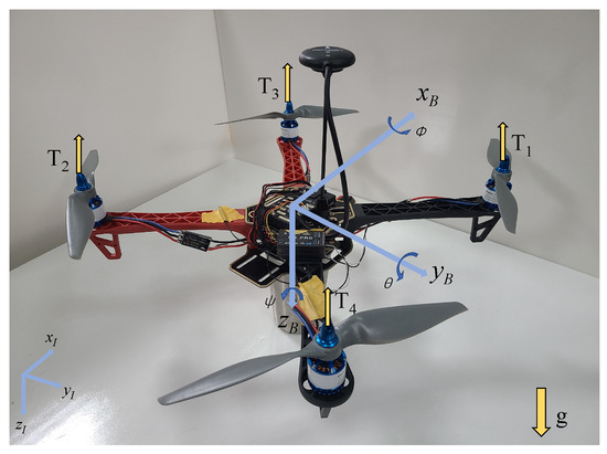 In this work, the quadrotor drone is considered as a rigid body with an X-configuration. As illustrated in Figure 1, the rotational motion of the quadrotor drone is described in the inertial frame and the body-fixed frame, which are denoted as the I-frame and B-frame, respectively [40].