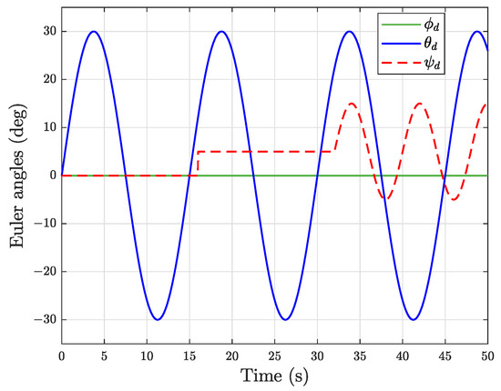 In the simulation, the parameters of the quadrotor drone attitude motion model are , , , , and . As depicted in Figure 3, the desirable attitude trajectories are considered as , , and . Furthermore, we add external disturbance torques as . The simulation initial parameters are set to and . All three attitude channels are considered to share the same group of controller parameters, which are displayed in Table 1.