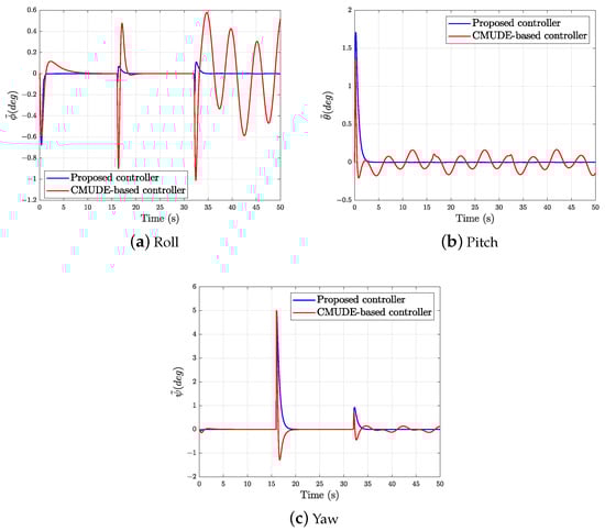 Attitude tracking errors generated by the proposed controller and the CMUDE-based controller.