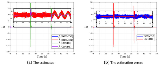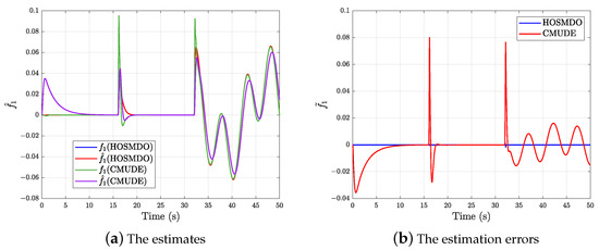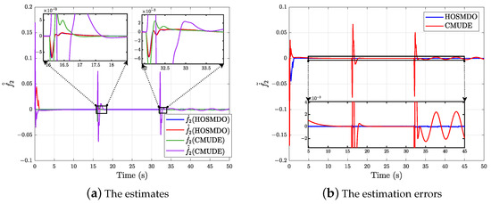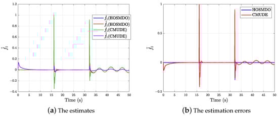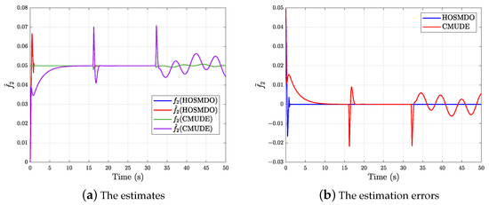 Figure 5, Figure 6, Figure 7, Figure 8, Figure 9 and Figure 10 show that both HOSMDO and CMUDE achieve high-precision estimation for constant signals (simulated from 0 s to 32 s). However, for time-varying signals (occurring from 32 s to 50 s), HOSMDO exhibits higher estimation accuracy. In addition, in response to the abrupt changes at 16 s and 32 s, CMUDE generates significantly larger transient overshoot compared to HOSMDO. These findings corroborate that HOSMDO is less sensitive to signal transients, is more accurate in capturing signal dynamics, and exhibits greater robustness due to its sliding mode properties.