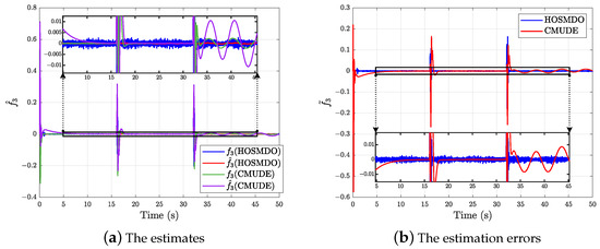 The comparison results of attitude tracking errors and disturbance estimation errors generated by the proposed HOSMDO-based controller and the CMUDE-based controller are shown in Figure 4, Figure 5, Figure 6, Figure 7, Figure 8, Figure 9 and Figure 10.
