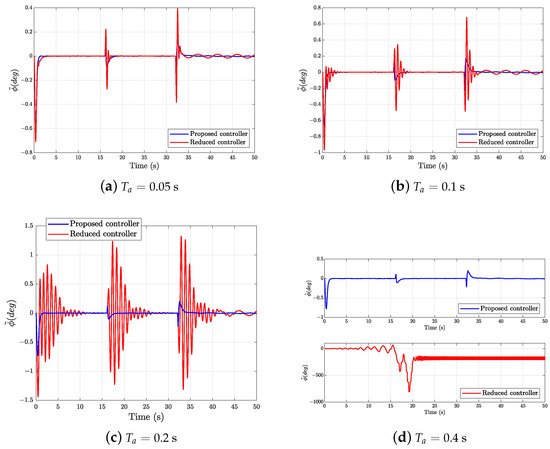 Figure 11, Figure 12 and Figure 13 illustrate the attitude tracking error results of three channels for the proposed controller (with actuator dynamics considerations) and the reduced controller (without actuator dynamics considerations) under different actuator time constants . As shown in Figure 11, Figure 12 and Figure 13, at the same , the reduced controller has poorer tracking performance compared to the proposed controller, with larger overshoot and stronger oscillations. Additionally, as increases, the control effectiveness of the reduced controller deteriorates, eventually leading to instability. This highlights the importance of considering actuator dynamics in the controller design process. The aggregated results of the proposed controller under different values are presented in Figure 14. It can be observed that the errors vary slightly under different values, showcasing strong robustness of the proposed controller in handling actuator dynamics.