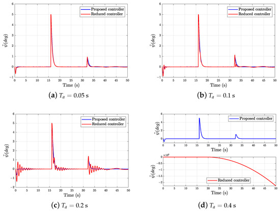 Comparing conditions (44) with (20), it can be observed that, in the reduced case, actuator dynamics imposes an additional constraint on the feedback gains and , which is related to the actuator parameter . Specifically, this constraint indicates that the actuator parameter restricts the upper limits of the controller parameters and . In addition, by comparing in the system (38) with in the system (42), it is observed that all terms in converge to zero within a finite time, whereas in , there is that do not converge to zero. Therefore, neglecting the actuator dynamics in the controller design process would result in uncertainties such as actuator uncertainty , reference trajectory information , and estimates of model disturbances and affecting the tracking error range of the closed-loop system, thereby impacting the overall control precision.