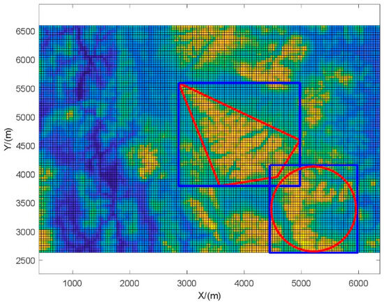 As can be seen in Figure 1, the red area represents the polygon area and search base circle area, which can more accurately select the area with a high probability of target existence, facilitating the avoidance of overlap between multiple areas. In contrast, the search rectangle represented by the blue area inevitably includes areas with a low probability of target existence in the search range, which results in the additional consumption of search resources and reduces search efficiency. Figure 1 demonstrates the advantages of the two proposed types of search areas in accurately selecting the search area, laying the foundation for subsequent search area optimization and search trajectory planning.