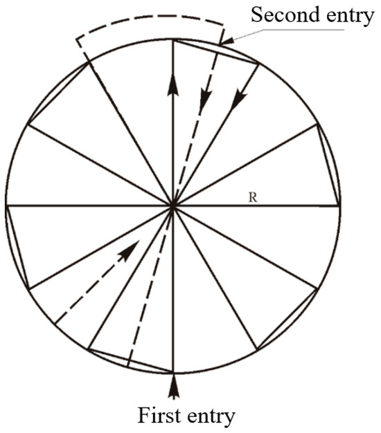 If the approximate location of the target is focused on a small area, the search base circle domain is usually used to determine the area to be searched. The center of the search base circle domain is the point with the highest probability of target existence, and the radius is determined according to need. Sector search, extended square search, and spiral search are all suitable for searching the search base circle domain, where sector search crosses the center multiple times, performing multiple repeated searches in the area with the highest probability of target existence, as shown in Figure 5.