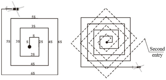 The extended square search method starts from the location with the highest probability of target presence and continuously expands outward through the extended square search method. During the secondary search, the search direction can be rotated by 45°, as shown in Figure 6.
