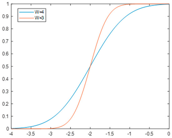 At the same time, according to Formula (10), using the built-in erf function in Matlab 2021, the relationship between W and POD is plotted, as shown in Figure 9.