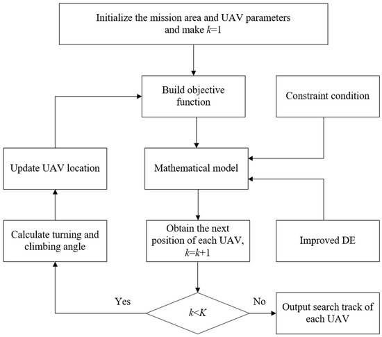 First, a new search area allocation method and corresponding trajectory planning model are constructed in Section 2. Then, factors affecting search efficiency are analyzed and a search objective function is established in Section 3. In order to optimize the objective function, an adaptive differential evolution algorithm and corresponding optimization process are constructed in Section 4 and Section 5. Experiments are conducted to verify and draw conclusions in Section 6 and Section 7.