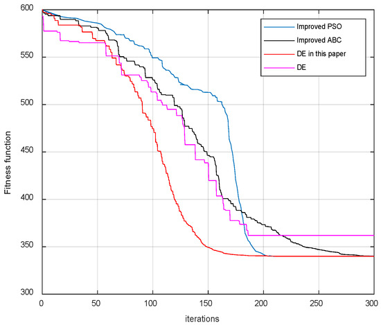 To reflect the performance of the optimization algorithm in this article, the algorithm in this article is compared with the classical DE algorithm, the algorithm in article [34], and the algorithm in study [40]. The comparison of the results of the fitness function during the optimization process is shown in Figure 22.