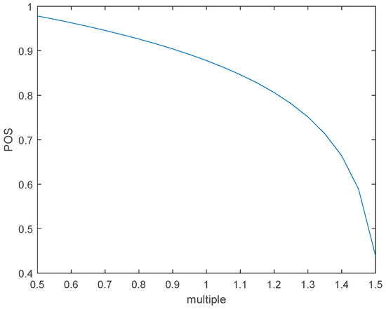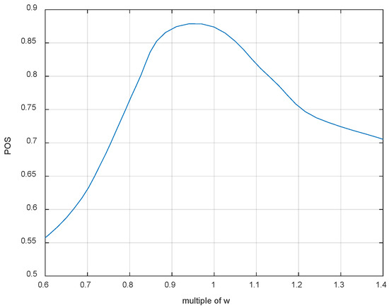 To further explore the impact of the UAV field of view width W on the search efficiency, the W value during the previous simulation process was set as the standard. The search field of view was changed by multiplying it by a factor ranging from 0.6 to 1.4, resulting in a relationship between W and POS, as shown in Figure 23.
