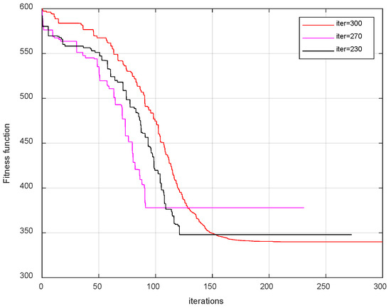 To investigate the effect of the number of iterations on the results, we set the number of iterations to 230, 270, and 300, respectively, and obtained the relationship between the number of iterations and the fitness function, as shown in Figure 25.
