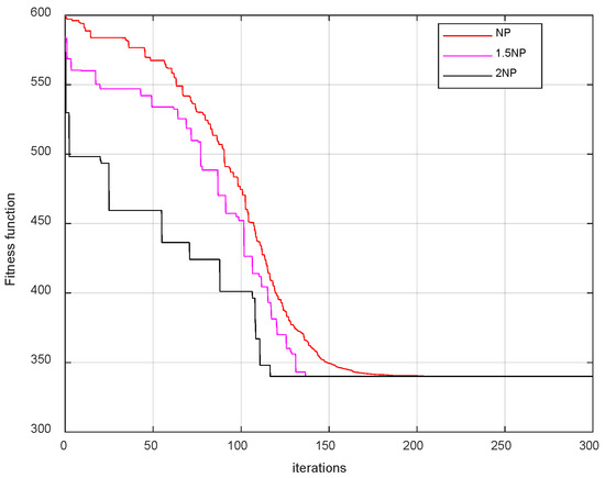 To study the impact of population size on algorithm performance, the population size of NP = 100 described earlier was used as a standard, and population sizes of 1.5NP and 2NP were set. Through experiments, the relationship between NP and the fitness function was obtained, as shown in Figure 26.