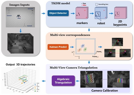 Firstly, a trained object detector is employed to generate bounding boxes of robots and markers in each view. Considering that there is noise in 2D detection, a filtering algorithm based on confidence and class is proposed to eliminate inaccurate detections. The multi-view correspondences module employs an MOT algorithm to address occlusion issues and assigns matched marker IDs. Utilizing the calibrated multi-view camera parameters, the 3D coordinates of markers are calculated, and the position and orientation of the robot are ultimately estimated by the coordinates of multiple markers.