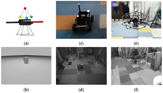 Test robot platforms and scenarios. (a) Simulated drone with markers. (b) Drone in simulation scenario (occlusion). (c) UGV with markers. (d) UGV in real scenarios. (e) Drone with markers. (f) Drone in real scenarios.