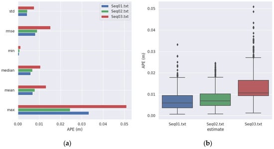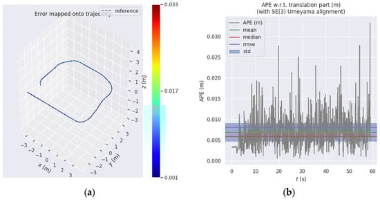 In order to show the accuracy of our system in translation and rotation, we used the corresponding two indicators, and , respectively. The translation accuracy indicator and rotation accuracy indicator are calculated by Equations (7) and (8), respectively. On this basis, we used the APE of each timestamp, i.e., to calculate the average , , and the root mean square error (RMSE) of all timestamps to measure the accuracy of the overall trajectory, as shown in Equations (9) and (10), where the total count of timestamps is represented by N.