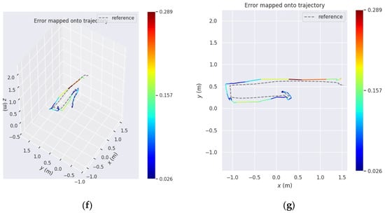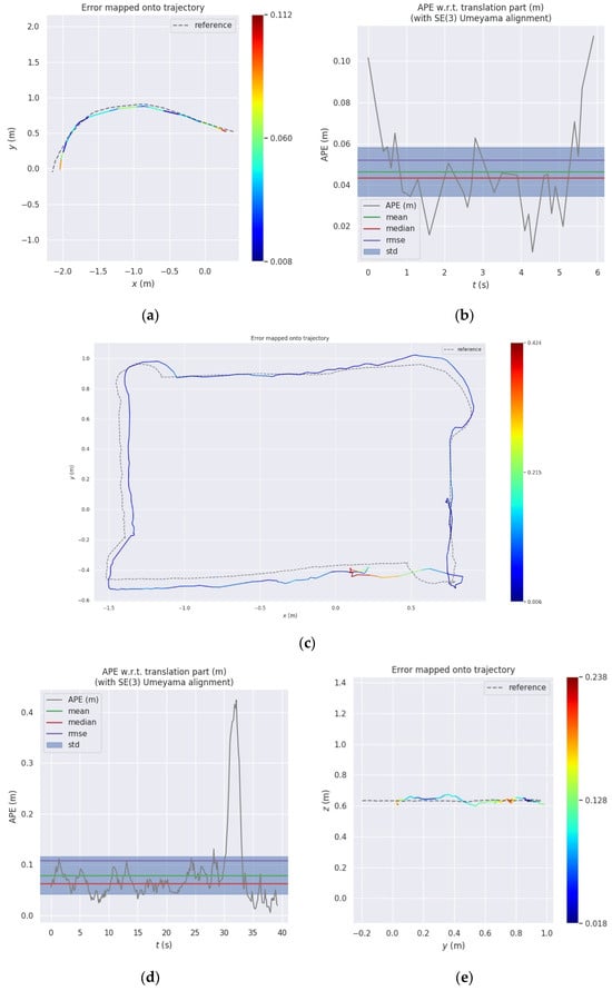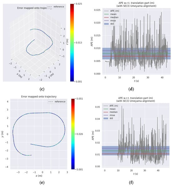 In assessing the precision of our Easy Rocap system, we use an error evaluation method (https://github.com/MichaelGrupp/evo (accessed on 14 September 2017)). The reference in the simulation scenario is the ground truth trajectory recorded in Gazebo, and the reference in the real scenario is the pose estimation result of Easy Rocap. For the evaluation of trajectory accuracy, the global consistency of the trajectories was assessed utilizing absolute pose error (APE) as a metric. As illustrated in Equation (6), the calculation of APE was made based on the estimated trajectory posture at timestamp , and the ground truth trajectory at timestamp .