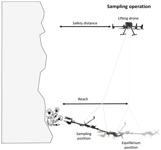 Past research projects have already demonstrated the advantages of using a suspended manipulator to keep a vertical clearance between a drone and any obstacles while minimizing the transmission of destabilizing moment to the drone during the manipulation operation [22,23,24,25]. However, the suspended manipulator workspace of these systems is limited and located directly under the lifting system. Usually, the lifting system moves the suspended manipulator as the latter uses its actuators to stabilize itself at its equilibrium point directly under the lifting system. The objective of the concept described here is to bring the whole system in close vicinity of the cliff, and then, to move only the suspended manipulator to perform a sampling operation on the targeted plant as shown in Figure 1. The main advantage of this strategy is that the drone maintains a horizontal and vertical safety distance with surrounding obstacles, while the platform can move with great precision to accomplish the sampling task. This design choice also aims to minimize the impact on the flight performance of the lifting drone, similarly to the suspended manipulator concepts presented earlier [28]. The length of the rope determines the reach of the suspended manipulator during the sampling operation. However, the added range with longer rope comes at the expense of a loss in positioning accuracy. The design of such a suspended manipulator must meet two main requirements to ensure the success of the sampling operation. The system must be able to move independently from the drone and to position its end effector with enough precision to collect plant material. This section gives an overview of the Mamba design. The suspended manipulator design was based on the initial version of the system which is presented in [28], this section presents changes that have been made to the system since the previous version.