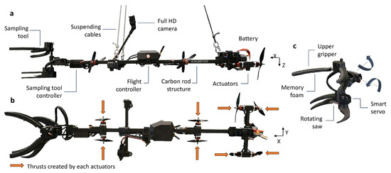 (a) Side view of the Mamba showing the components and the suspending cables. (b) Top view of the Mamba showing the thrusts generated by the actuators. (c) Close-up of the sampling tool and 2-DOF wrist specifically designed to sample plants.
