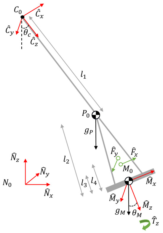The model of the system, shown in Figure 4, can be placed in a Newtonian frame N, and it is composed of a rigid frame C representing the cable with its origin C0 located at the anchor point on the lifting system, and a rigid body M representing the manipulator with its origin located on the suspended manipulator CoM. To achieve a good representation of the physical system and the carabiner used to attach the suspended manipulator to the cable, a mass at the pivot point is considered, and is represented by a particle located at P0. The point P0 is located at a distance L1 from C0, while the CoM of body M is located at a L2 distance from P0. Using these frames and bodies, the suspended manipulator can be modeled as a spherical double pendulum with a first pendulum composed of the cable between the drone and the particle P, and a second pendulum that includes the particle P and the rigid body M. Both pendulum’s motion can be described using ZYX Euler’s angles with the yaw orientation of the two pendulums being considered with a single variable. Therefore, the states of the system include 5 orientations (θ1C, θ1M, θ2C, θ2M, θ3m) and their derivatives, where θXC represents the orientation of frame C, θXM represents the orientation of the M frame, with θ1X, θ2X and θ3X representing respectively the roll, pitch, and yaw axes.