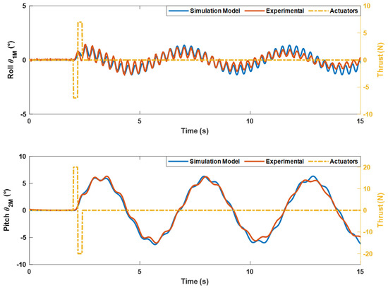 For each of the axes (i.e., roll and pitch), we observe the second oscillation mode of the system caused by the double pendulum configuration. It is important to note that the second oscillation mode has a greater impact on the roll axis mainly because of the lower inertia of the system around this axis. The simulation model has approximately the same response as the real system during the first 10 s following the signal sent to the actuators. However, after this period, we notice that the absence of damping in the model leads the model response to diverge from the real system response. Although a more complete model might need to consider the damping, the focus is put on achieving a desired closed-loop performance, and the system will not move as freely during its operation. As a result, the inclusion of damping terms in the physical model was not deemed necessary.