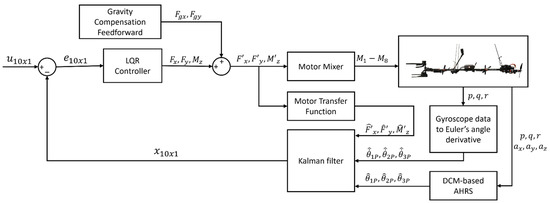 A linear model is needed, as both the chosen state estimator architecture (i.e., Kalman filter), and the optimal controller (i.e., LQR) will rely on a linear model of the system. Linearizing the system to its natural equilibrium point (i.e, minimum potential energy) yields a state space model, where the system inputs (u) are the actuators on the Mamba as described in the model and θ1X, θ2X and θ3X represent respectively the roll, pitch, and yaw axes state variables. The correction phase of the Kalman filter relies on a gyroscope (p, q, r) for the Euler’s angle derivative and a DCM-based AHRS output [33] for the roll and pitch orientation. We get the following state space model representation: