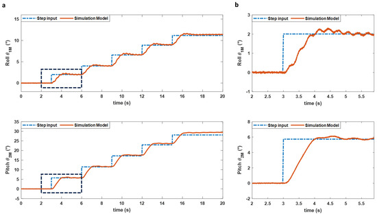 (a) Consecutive step inputs applied to the model in simulation to validate the performance of the control system on the roll and pitch orientation. (b) Close up of the first step input for the roll and pitch orientation of the Mamba.