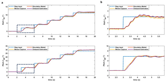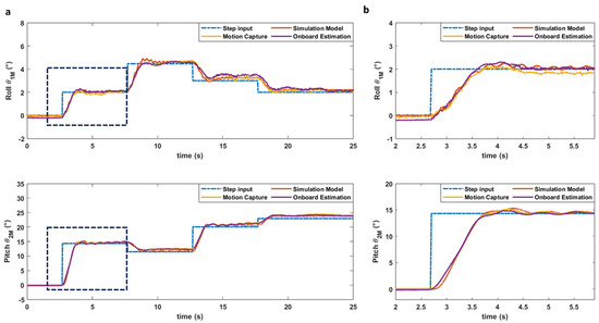 (a) Comparison of the model simulation, the motion capture system, and the flight controller data for consecutive step inputs applied separately on the roll and pitch axes. (b) Detailed comparison of the first step input on the roll and pitch axes.