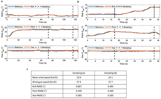 (a) Orientation of the Mamba during a sampling operation with a mean wind speed of 12.0 km/h and wind gusts reaching 24.1 km/h. (b) Orientation of the Mamba during a sampling operation with a mean wind speed of 27.9 km/h and wind gusts reaching 37.7 km/h. (c) Comparison of the root mean square error for each axis during the sampling operation for (a), and (b) flight.