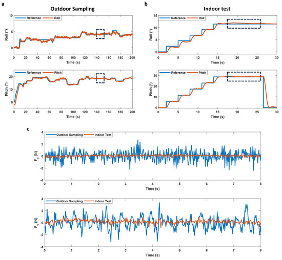 (a) Orientation of the Mamba during a sampling operation with a mean wind speed of 11.1 km/h and wind gusts reaching 21.1 km/h. (b) Orientation of the Mamba during an indoor step test. (c) Comparison of the actuator thrust command for the roll and pitch axes during a static portion of the sampling operation (a), and the step test (b) for 8 s with the static component of the command filtered out.