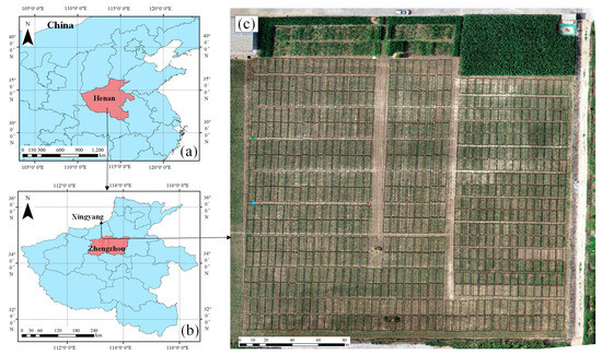Study area and maize experimental field. (a) Location of the study area in China. (b) Map of Xingyang city, Zhengzhou city, Henan Province. (c) UAV orthomosaic of the study area. The black boxes show the plots, with a total of 790 plots.