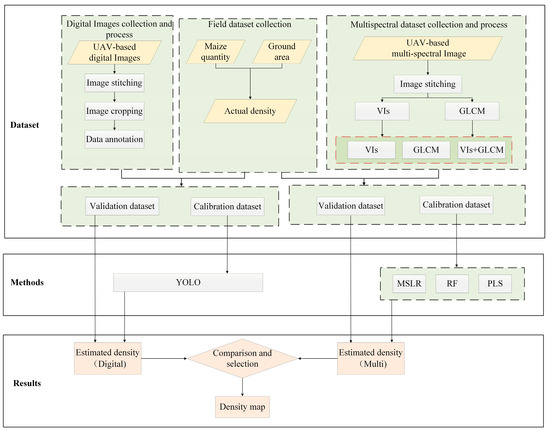 - Multispectral data processing and density estimation: This study extracted the VIs and the gray-level co-occurrence matrix (GLCM) texture features from the multispectral data. These features were combined and used in regression models (e.g., multiple linear stepwise regression (MLSR), random forest (RF), and partial least squares regression (PLS) to estimate the planting densities.