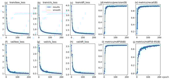 In Figure 4, this study presents the training results curve for the optimal object detection model, YOLOv8n, that was trained for a total of 200 epochs. During the initial 100 epochs, we observed a rapid decrease in the bounding box loss (Box Loss), as shown in Figure 4a,f; the classification loss (Cls loss), shown in Figure 4b,g; and the dynamic feature learning loss (DFL Loss), shown in Figure 4c,h. Subsequently, after 100 epochs, these loss functions gradually stabilized. Additionally, improvements in precision (Figure 4d), recall (Figure 4e), mAP@50 (Figure 4i), and mAP@50-95 (Figure 4j) were evident in the first 20 epochs, which were followed by stable states.