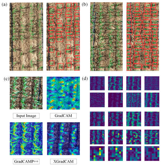 Object detection and recognition results and interpretability analysis. (a) Recognition results for communities with low planting densities. The red frames represent the detected maize. (b) Recognition results for communities with high planting densities. (c) Heatmap of recognition. The areas with bright colors represent the areas of interest for the model. (d) Feature visualization of the recognition process.