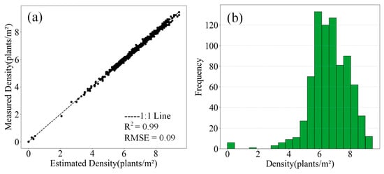 This study used the trained YOLOv8n model to estimate the maize planting densities in 790 plots. The results are shown in Figure 6a. The results show highly accurate estimations, demonstrating a strong positive correlation between the model estimates and the actual observations, with R2 = 0.99 and RMSE = 0.09 plants/m2. Figure 6b shows the distribution of the maize planting densities, revealing that the majority of plots had densities ranging between 5 and 8.5 plants/m2.