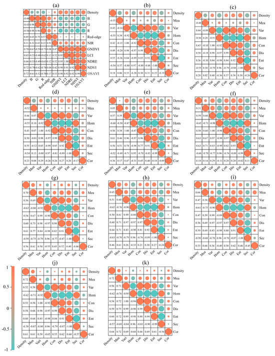Correlation analysis results. (a) Correlation analysis between the VIs and planting density, (b) R–GLCM correlation analysis, (c) G–GLCM correlation analysis, (d) B–GLCM correlation analysis, (e) Red-edge–GLCM correlation analysis, (f) NIR–GLCM correlation analysis, (g) GNDVI–GLCM correlation analysis, (h) LCI–GLCM correlation analysis, (i) NDRE–GLCM correlation analysis, (j) NDVI–GLCM correlation analysis, and (k) OSAVI–GLCM correlation analysis.