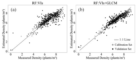Estimation results for the maize planting densities. (a) The RF and VIs were used to estimate the planting densities. (b) The RF and VIs+ GLCM were used to estimate the planting densities.