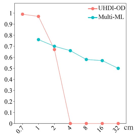 The pixel size of the original digital images is 0.7 cm and the pixel size of the original multispectral images is 1 cm. Through resampling, this study adjusted the pixel sizes of both the digital and multispectral images to 1 cm, 2 cm, 4 cm, 8 cm, 16 cm, and 32 cm, to investigate the impact of resolution on the estimation accuracies (measured using R2) of the two methods (UHDI-OD and Multi-ML). The results are shown in Figure 9. Both methods were trained on images at their respective original resolutions and the best models were directly used to estimate the planting density of 790 plots. When the pixel size was less than 2 cm, the accuracies of UHDI-OD are higher than that of Multi-ML. However, when the pixel sizes exceeded 2 cm, the accuracies of UHDI-OD rapidly decreased to 0, while the accuracies of Multi-ML remained above 0.5. This indicates that the image resolution significantly affects UHDI-OD, especially at lower resolutions, where its performance is noticeably constrained. In contrast, Multi-ML maintains relatively stable estimation accuracies across different resolutions, demonstrating good adaptability to resolution changes.